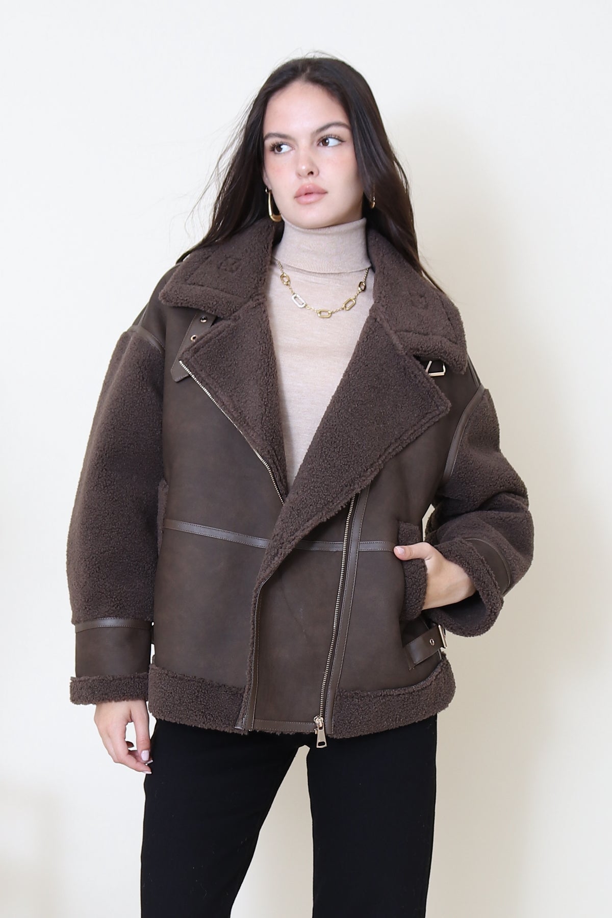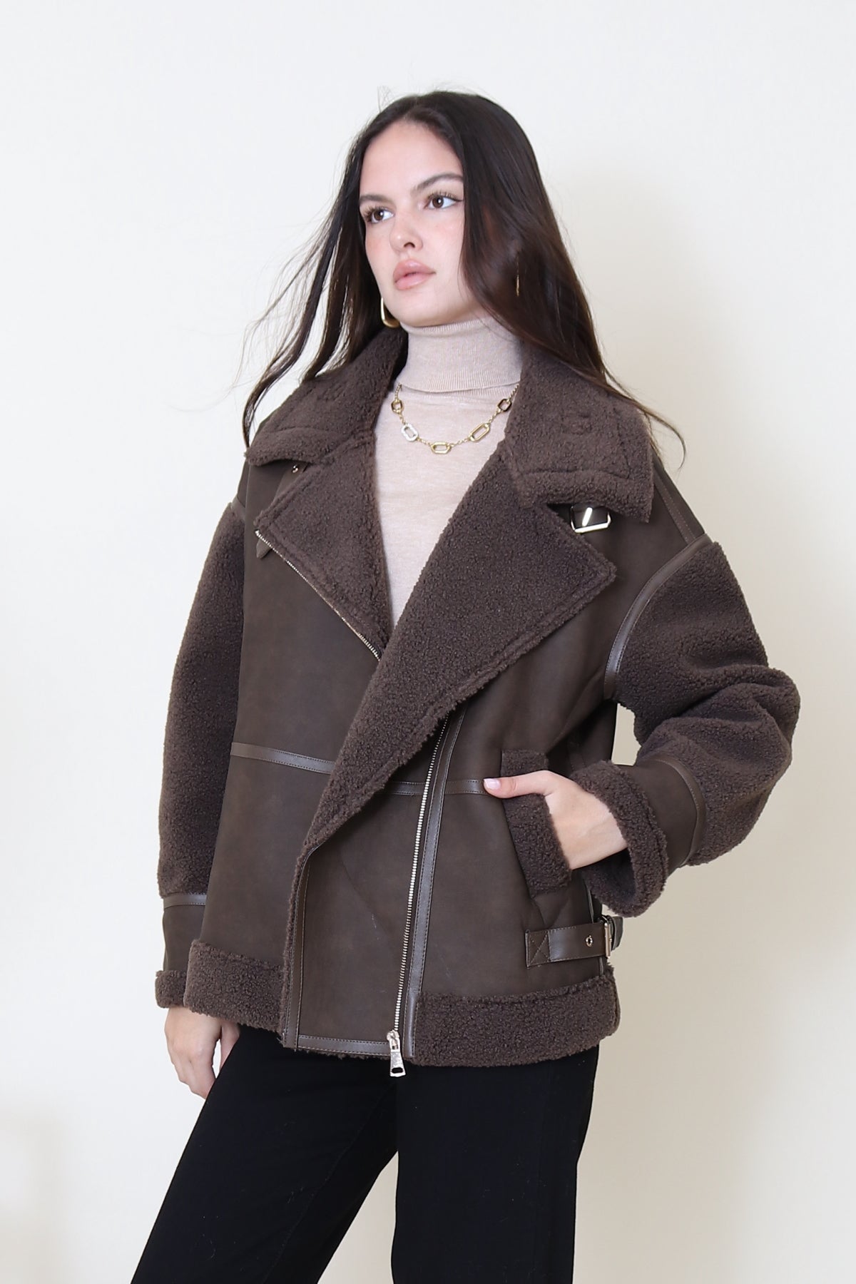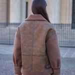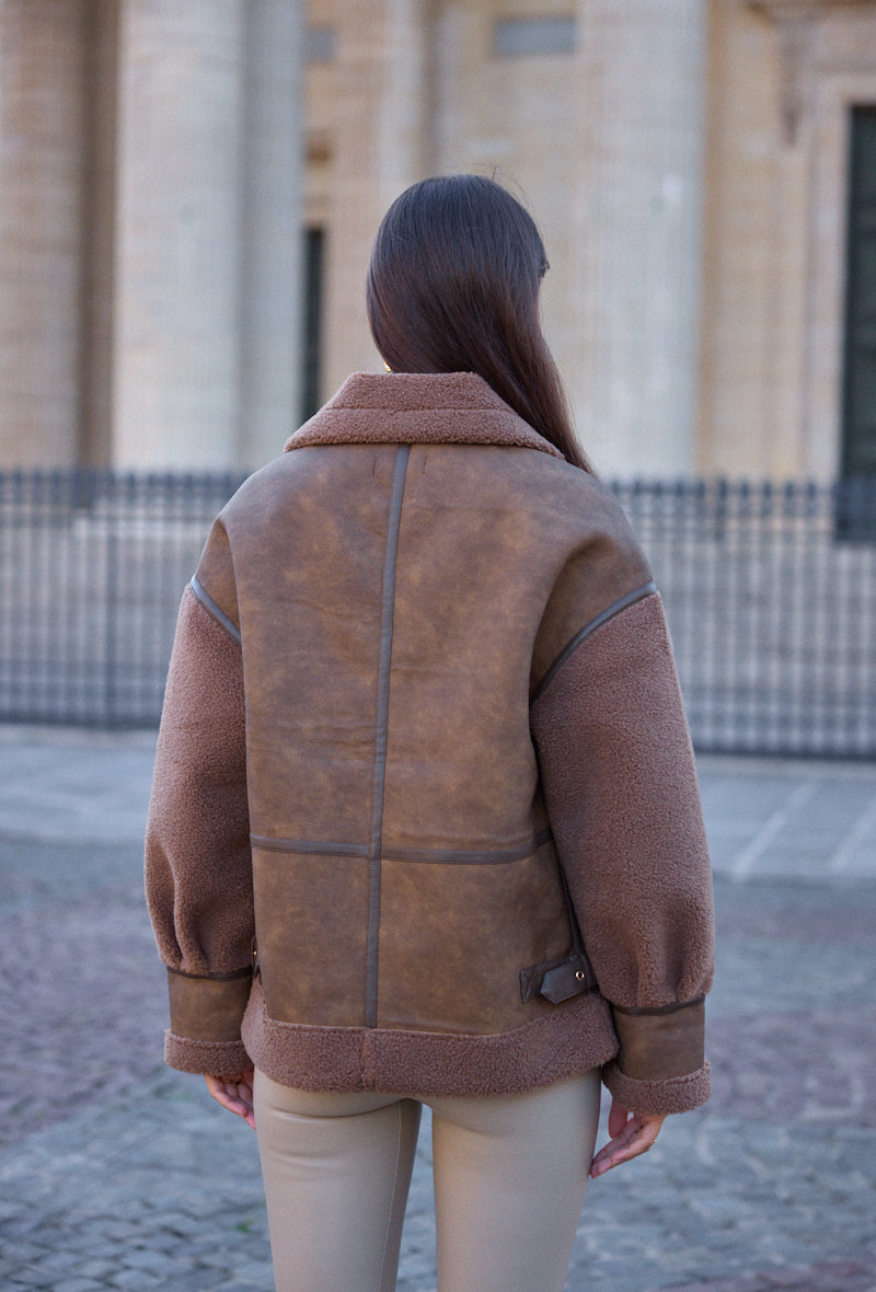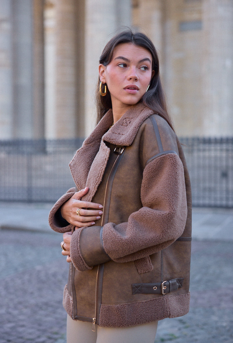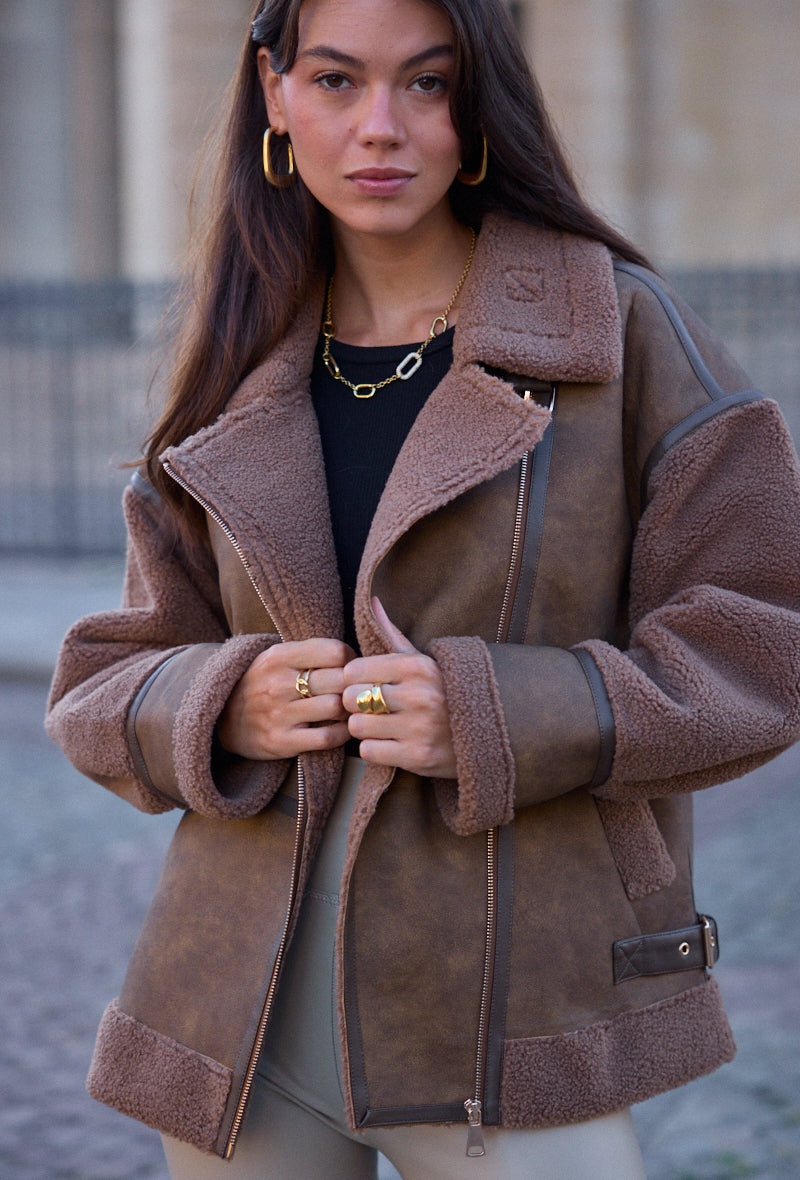 Veste aviateur oversize effet moutonnée doublée pour un confort optimal et un style affirmé en saison froide.