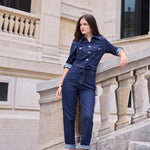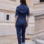 Combinaison en denim avec ceinture intégrée, idéale pour un look moderne et confortable au quotidien.