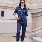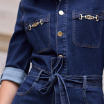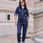 Combinaison en denim, idéale pour un look urbain chic et confortable au quotidien.