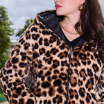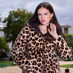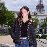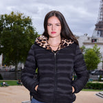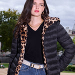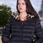 Doudoune chaude et réversible idéale pour l’hiver : un côté en tissu matelassé uni, l’autre en fausse fourrure effet léopard pour un look modulable et tendance.