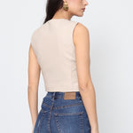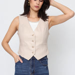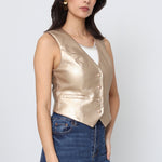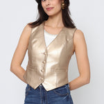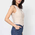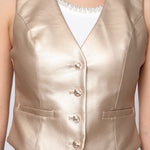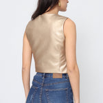 Gilet sans manches en similicuir, idéal pour un look moderne et tendance, à porter seul ou en superposition. Sa coupe ajustée et ses finitions soignées en font une pièce incontournable des dernières tendances mode.