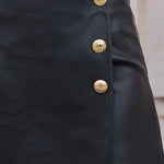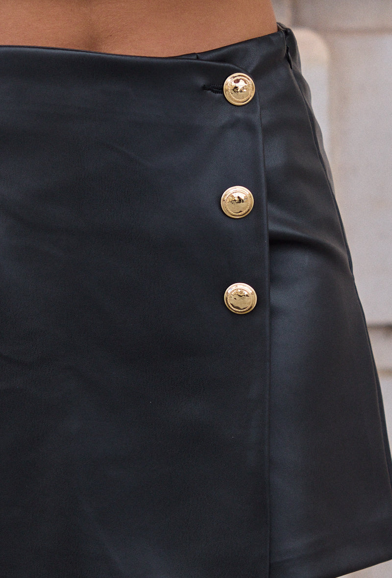 Jupe-short en similicuir à taille haute, rehaussée de boutons dorés sur le devant. Allie audace et élégance pour un look moderne et raffiné, tout en garantissant un confort absolu grâce à son short intégré.