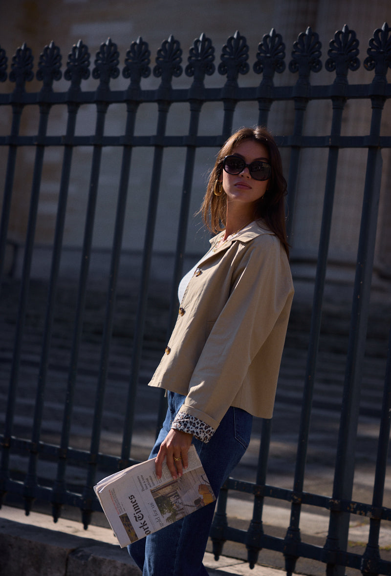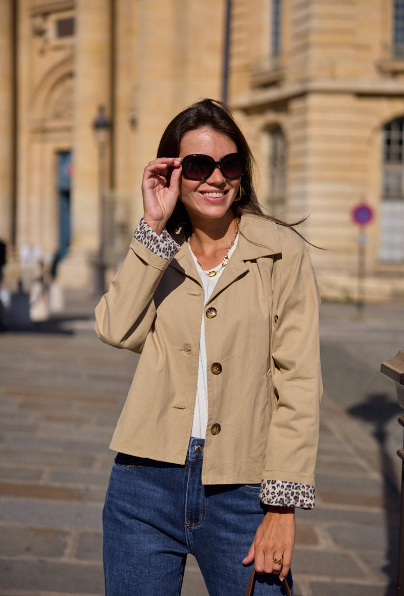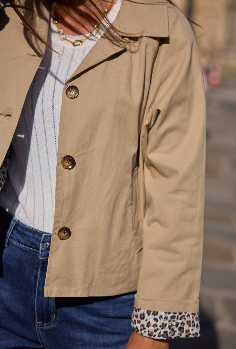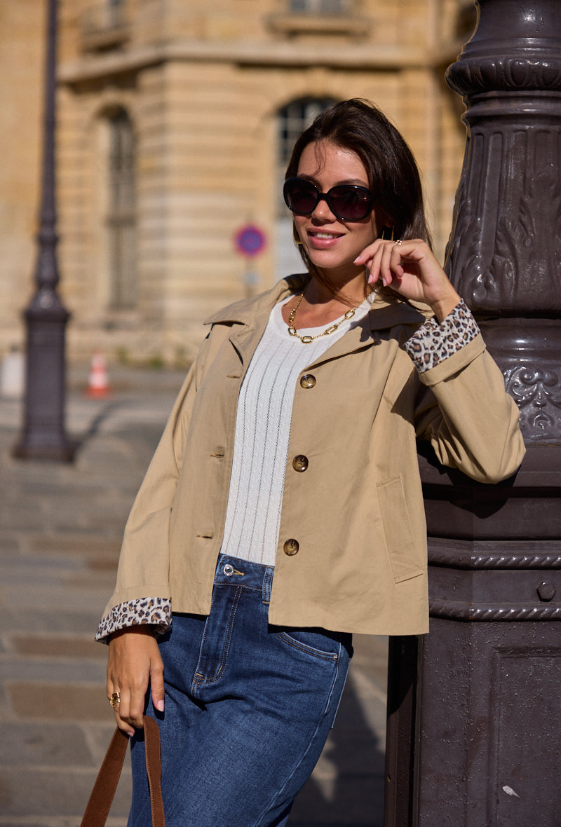 - Détails : Doublure et poignets à imprimé léopard, boutons effet corne