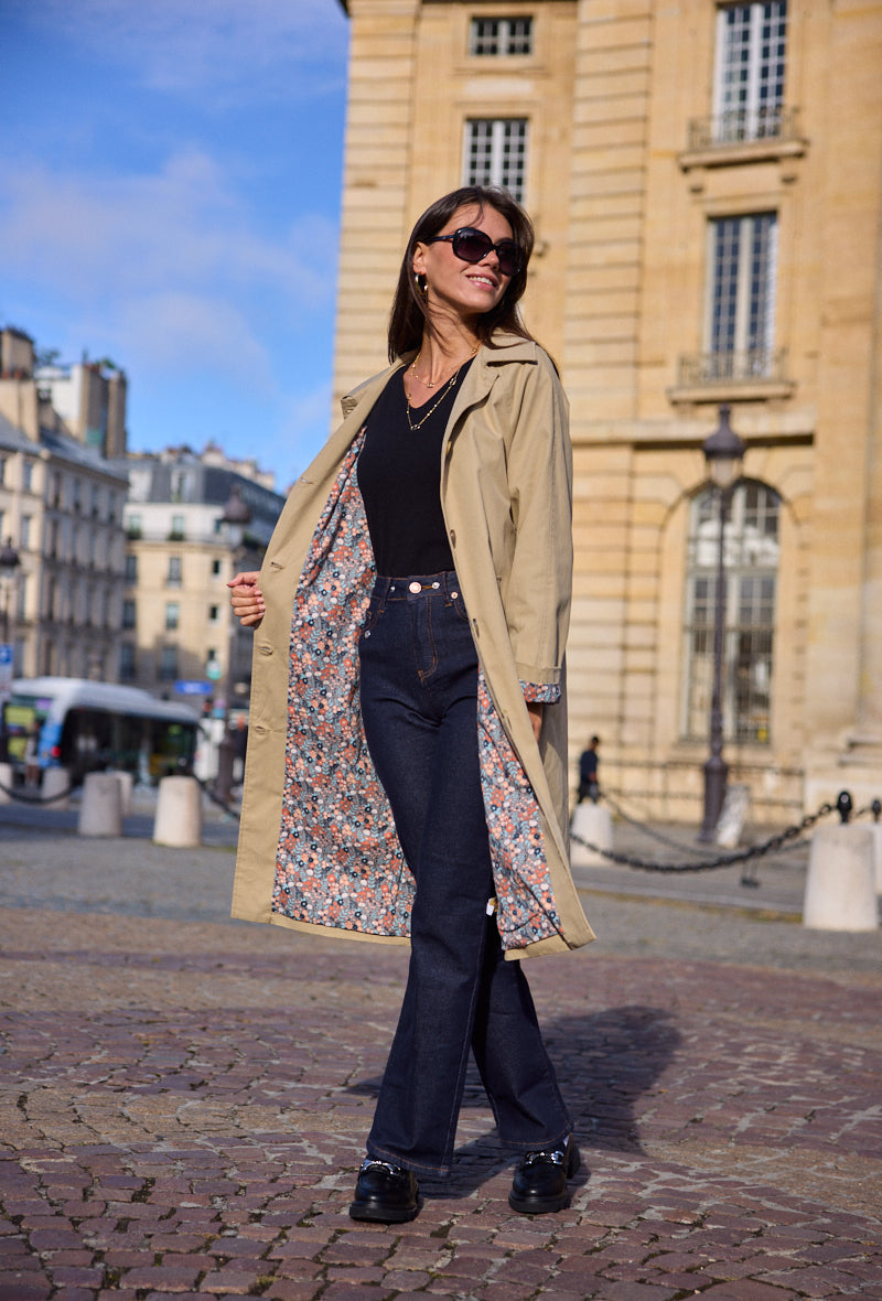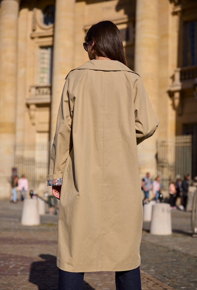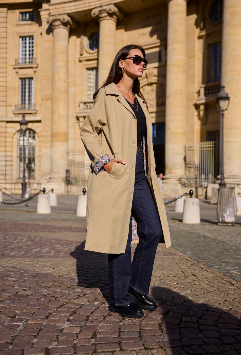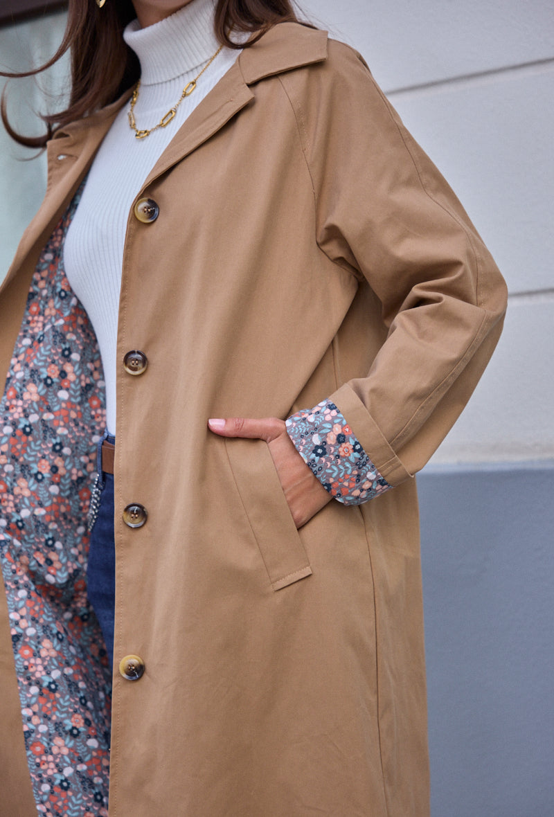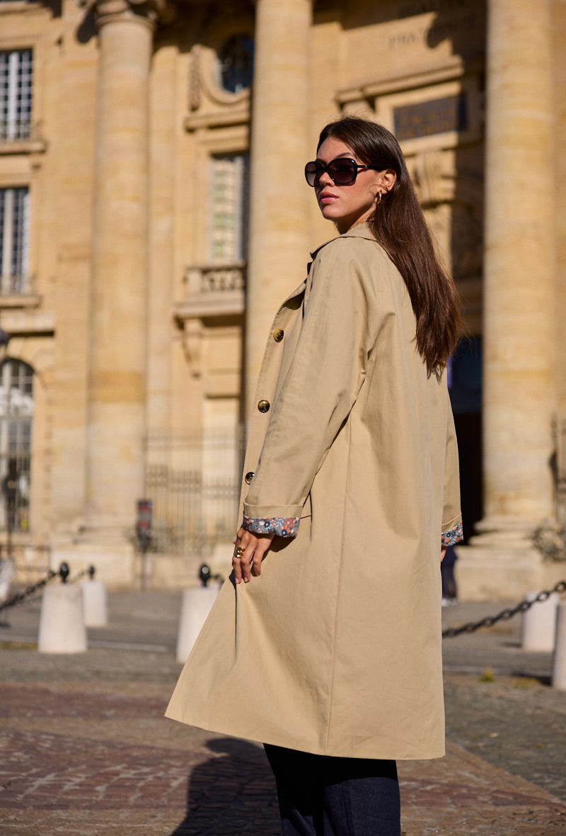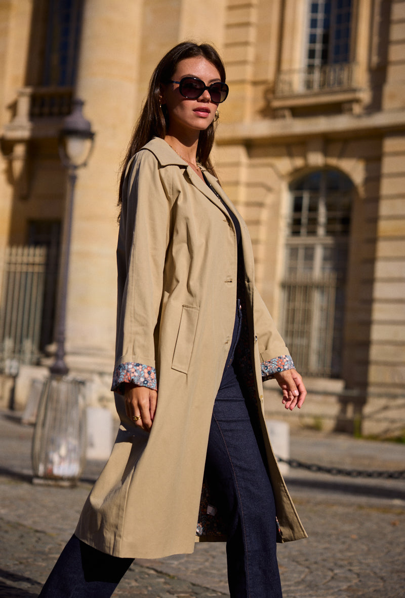 Trench léger et pratique, parfait pour la mi-saison. Sa coupe mi-longue et sa doublure imprimée liberty offrent une touche raffinée qui modernise ce grand classique du vestiaire.