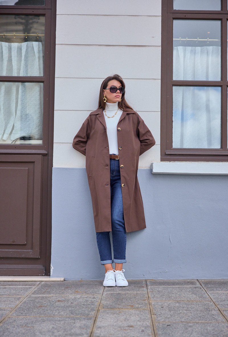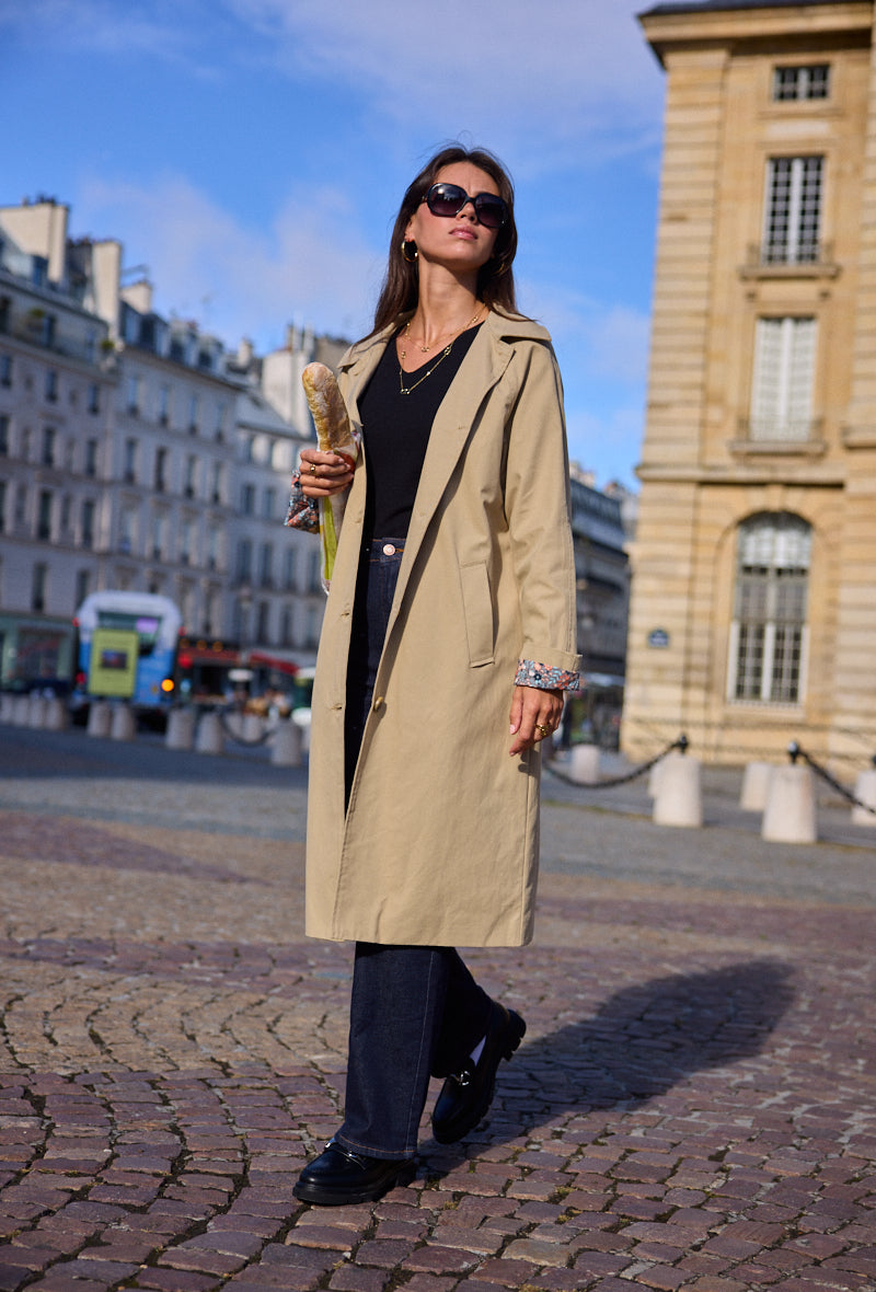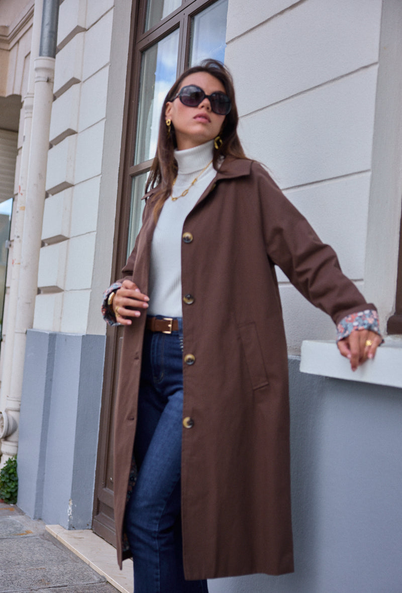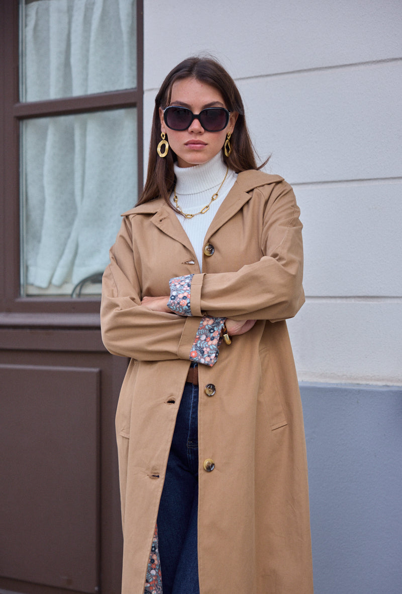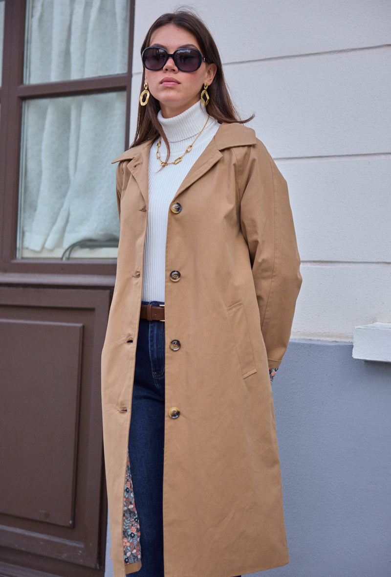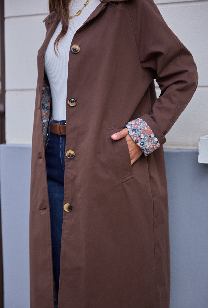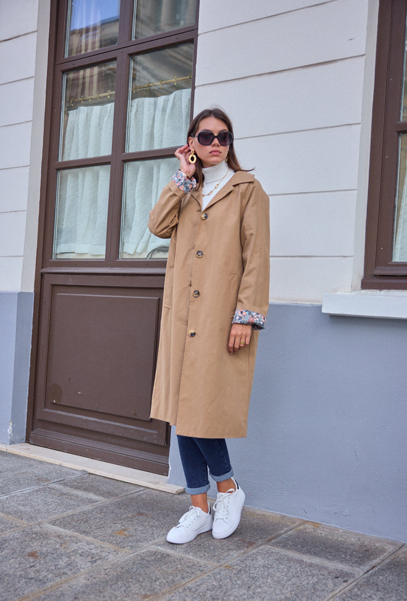 Trench léger et pratique, parfait pour la mi-saison. Sa coupe mi-longue et sa doublure imprimée liberty offrent une touche raffinée qui modernise ce grand classique du vestiaire.