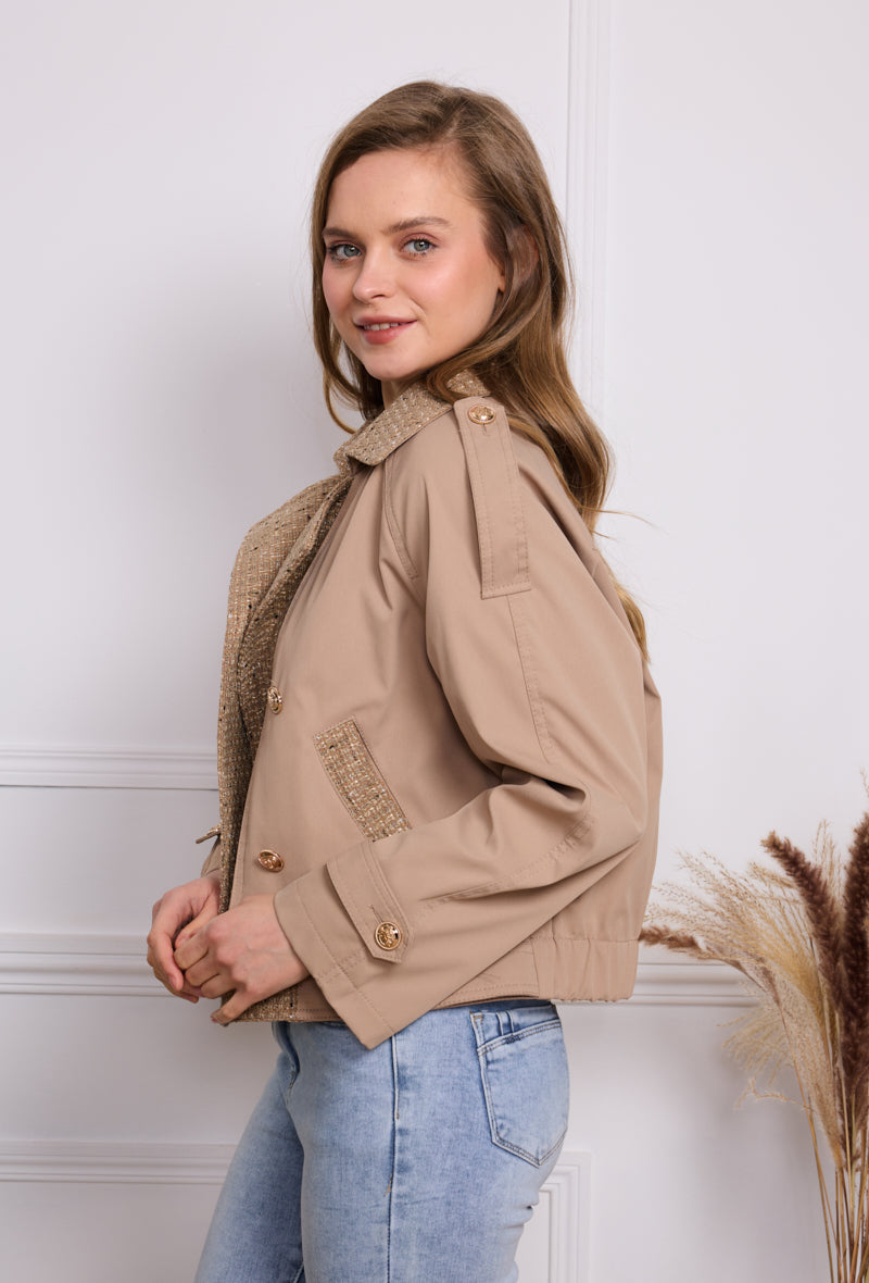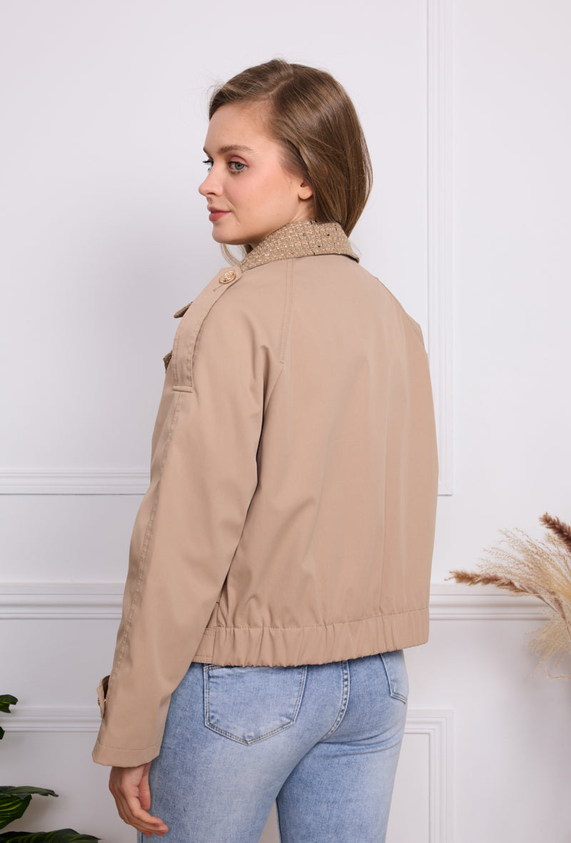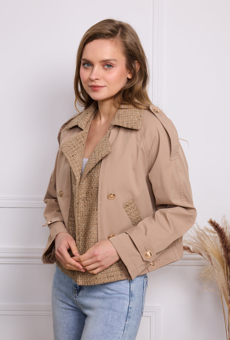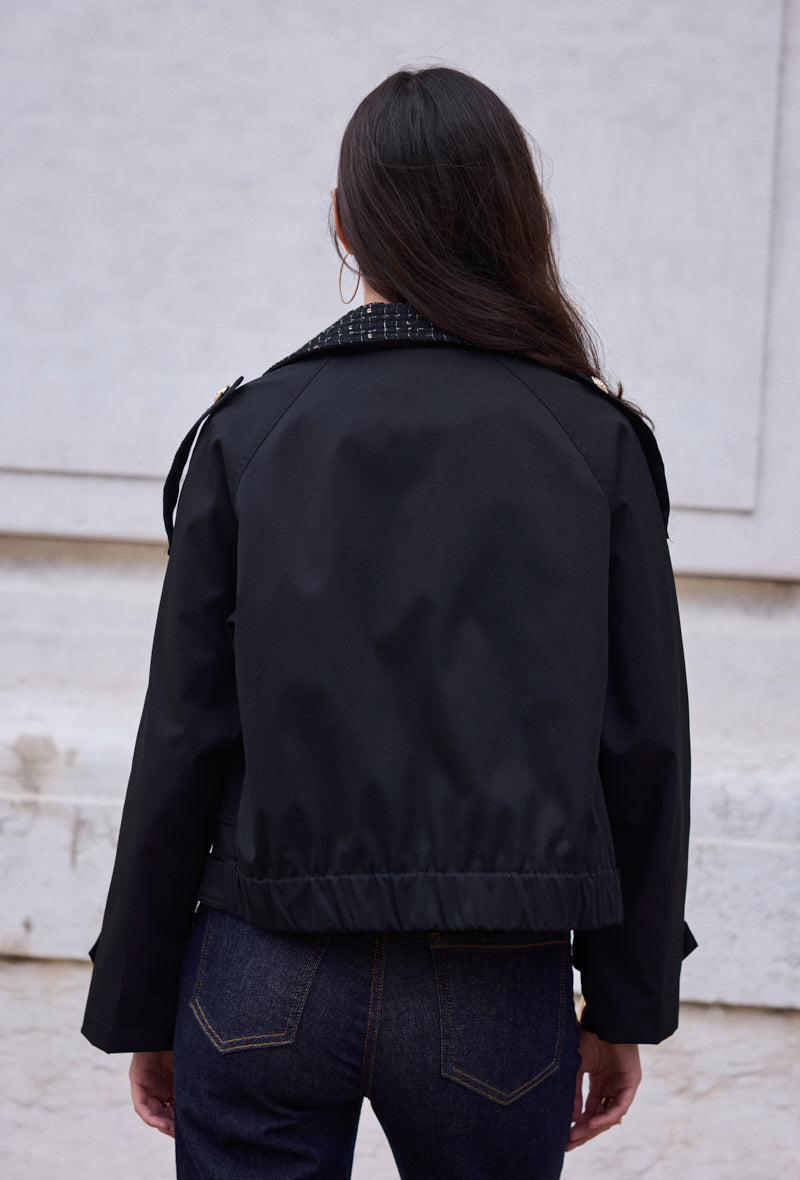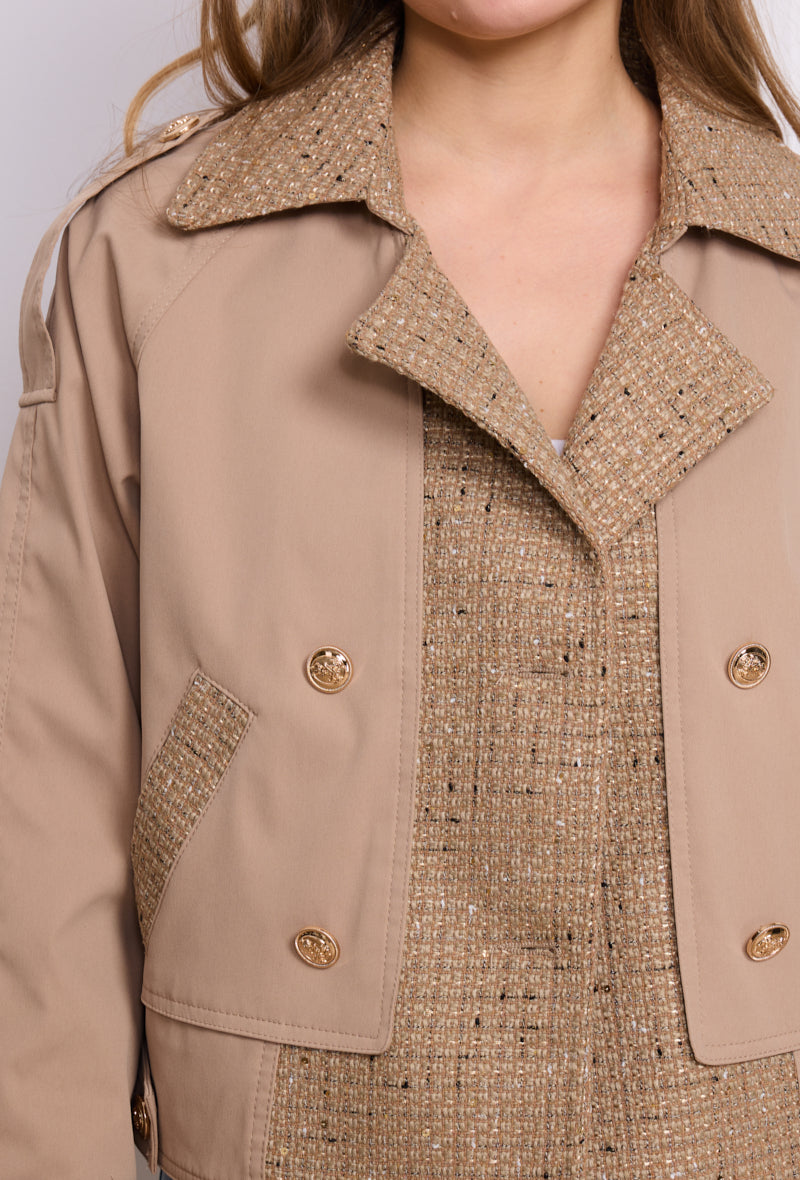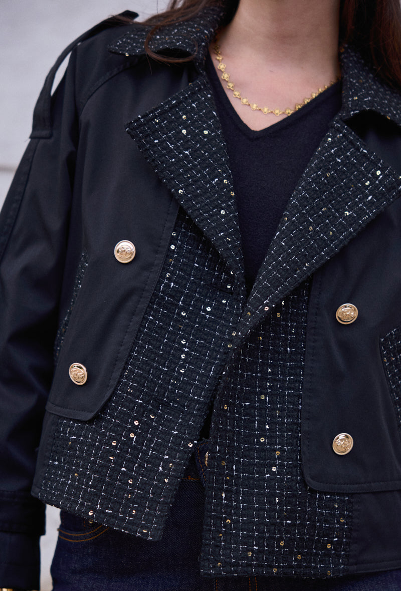 - Détails : Épaulettes décoratives, revers et poches en tissu contrasté façon tweed