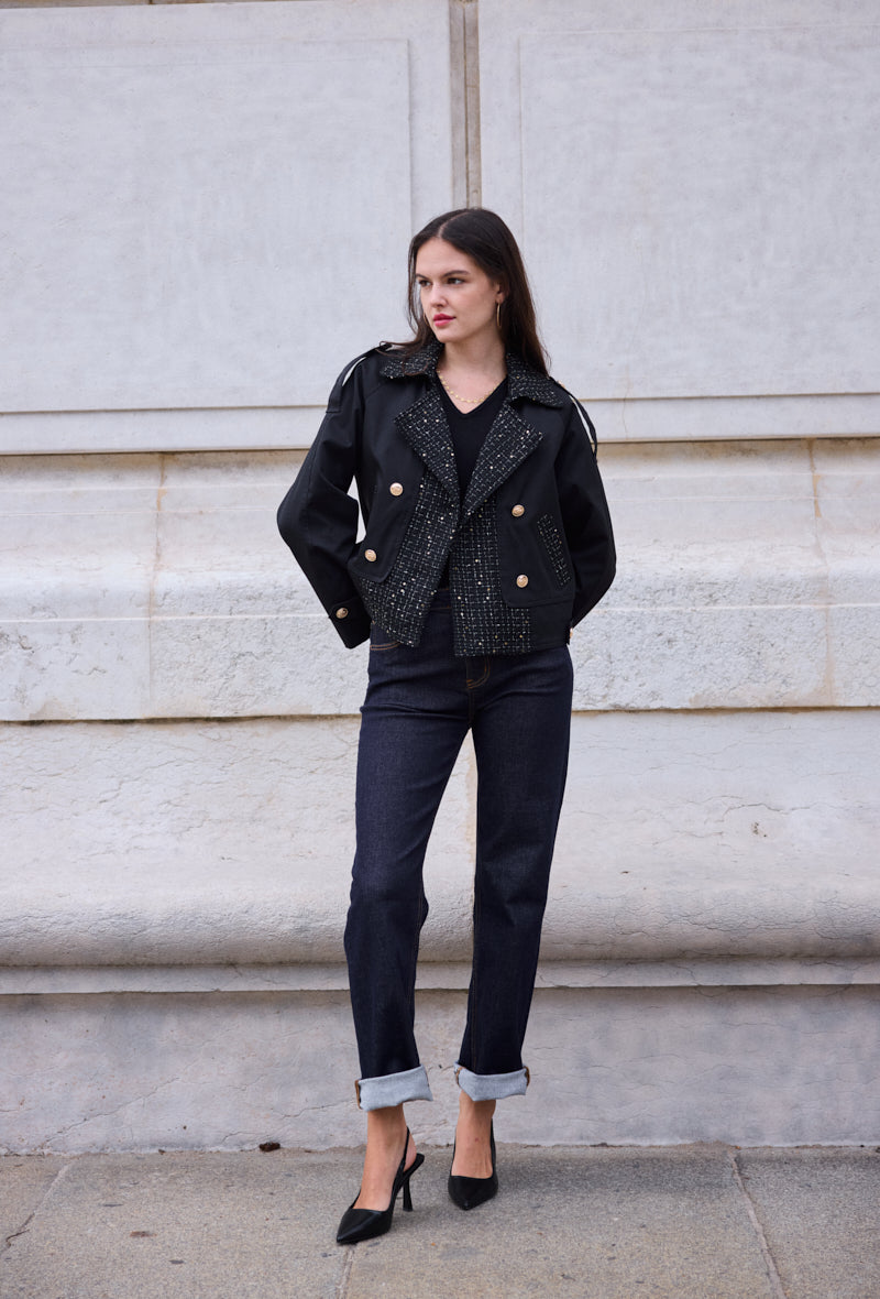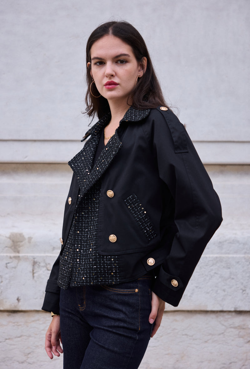 La veste Mila réinvente le trench avec une touche moderne et sophistiquée. Sa coupe courte structurée et ses finitions façon tailleur créent un parfait équilibre entre allure citadine et chic intemporel. Les boutons dorés gravés et les épaulettes apportent une note raffinée et assumée à cette pièce phare de mi-saison.