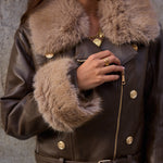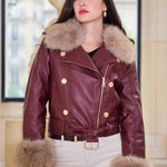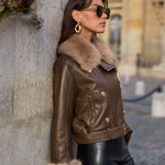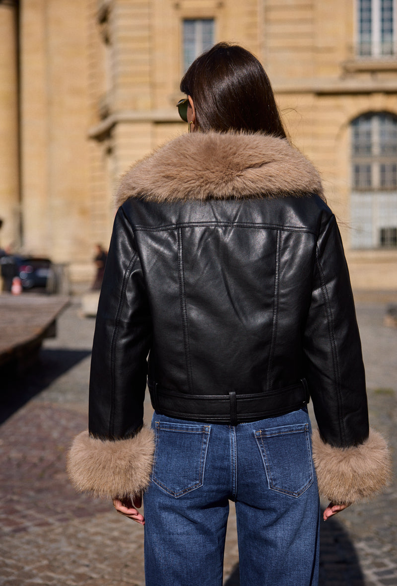Veste courte en similicuir ornée d’un large col et de poignets en fausse fourrure douce. Son design croisé et sa ceinture ajustable subliment la silhouette tout en apportant confort et chaleur pour la saison.