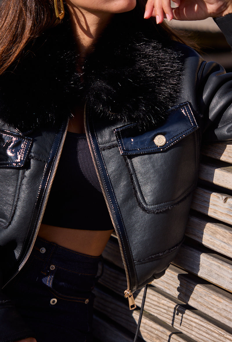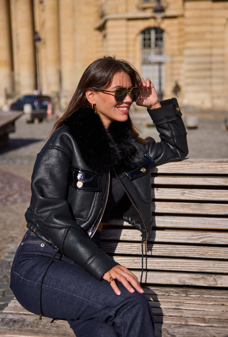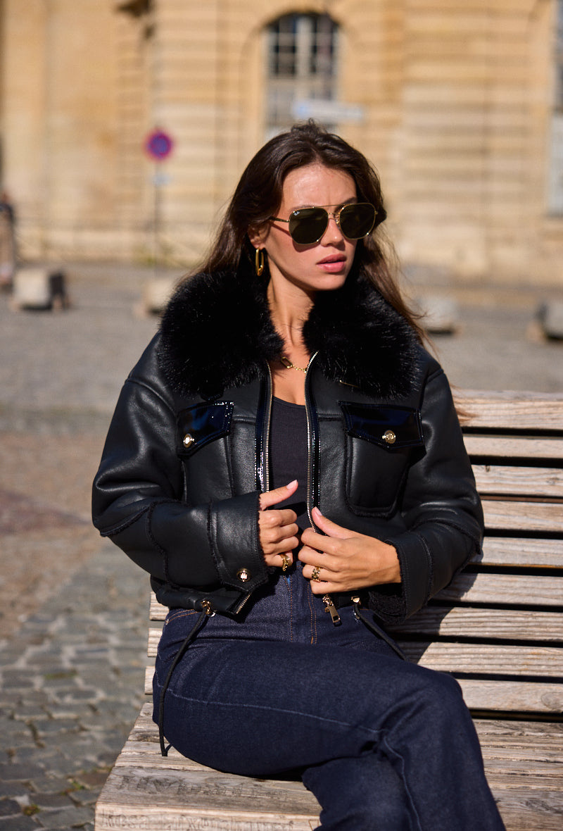 Blouson court à col fausse fourrure, parfait pour un style urbain élégant et réconfortant en saison froide.