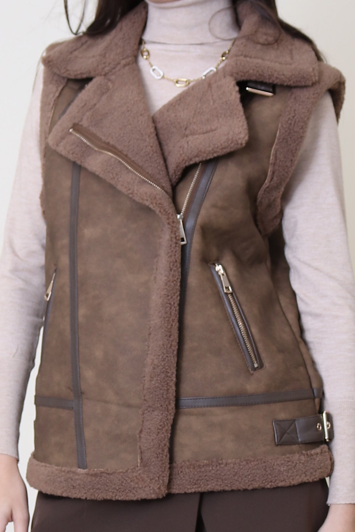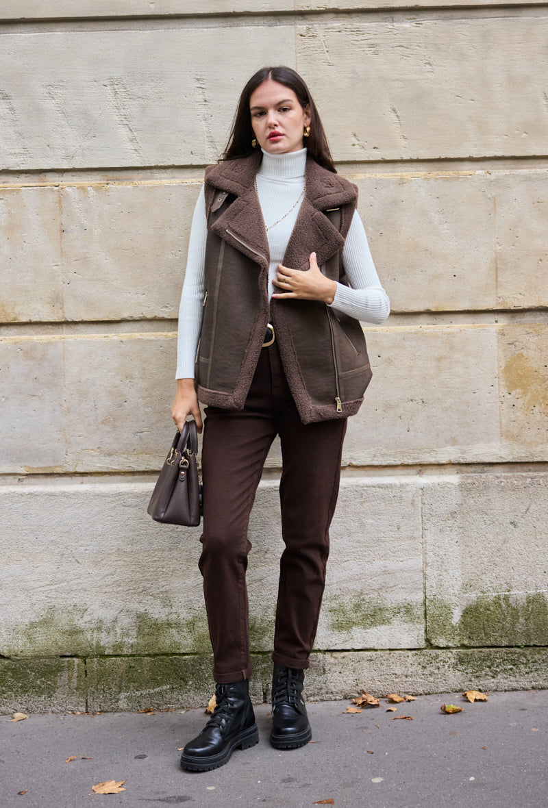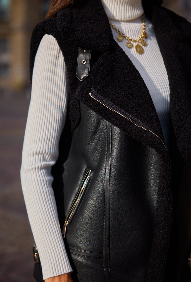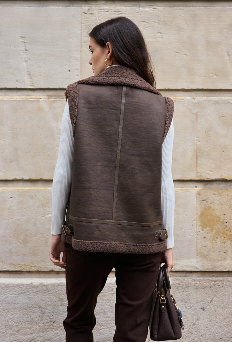 Gilet sans manches façon aviateur, doublé effet moutonné, parfait pour superposer avec élégance en mi-saison et en hiver.