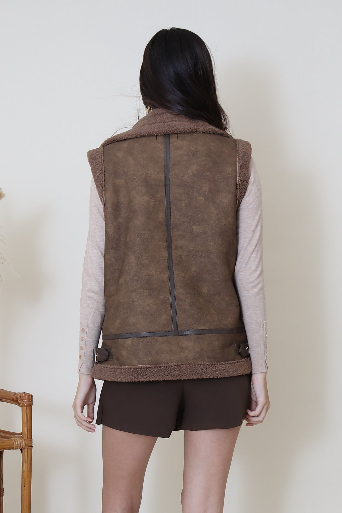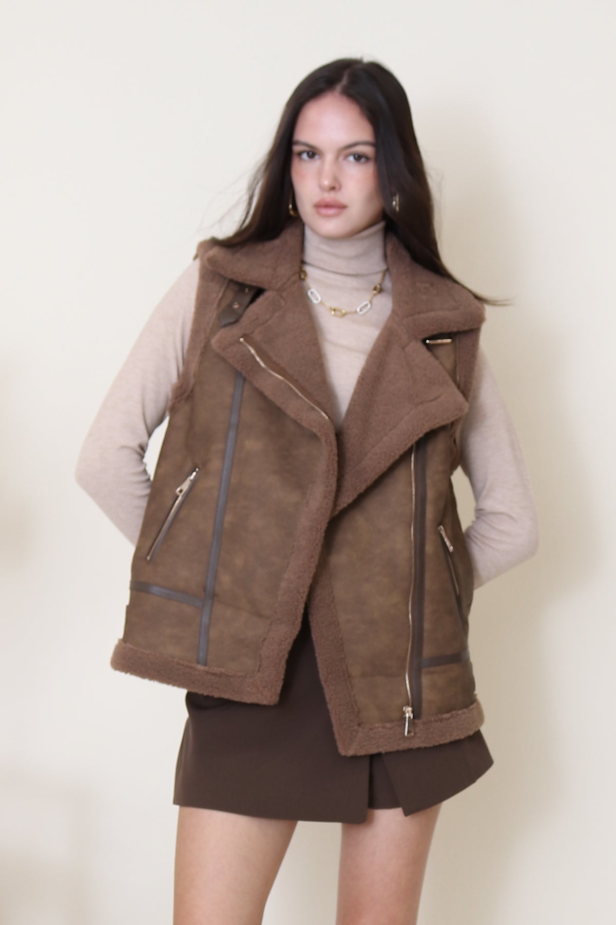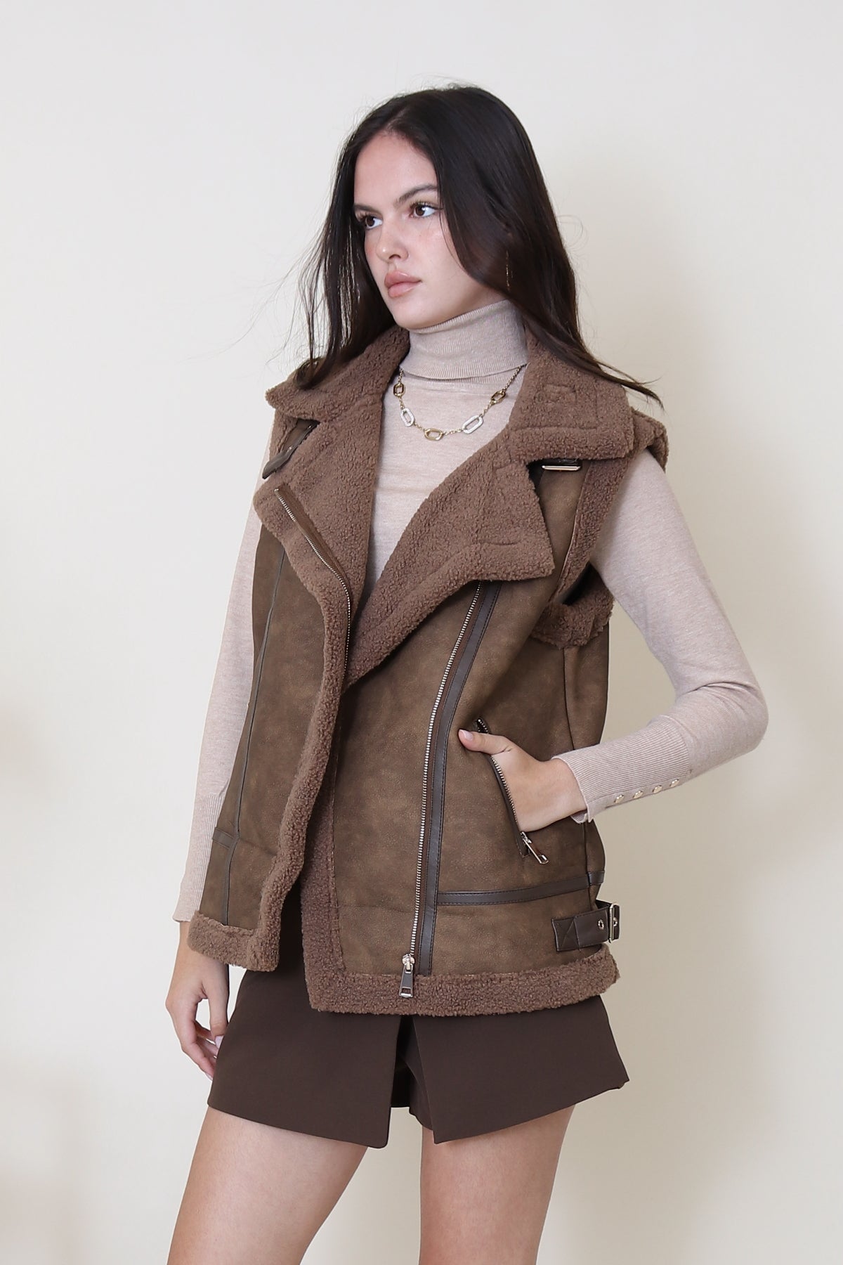 Gilet sans manches façon aviateur, doublé effet moutonné, parfait pour superposer avec élégance en mi-saison et en hiver.
