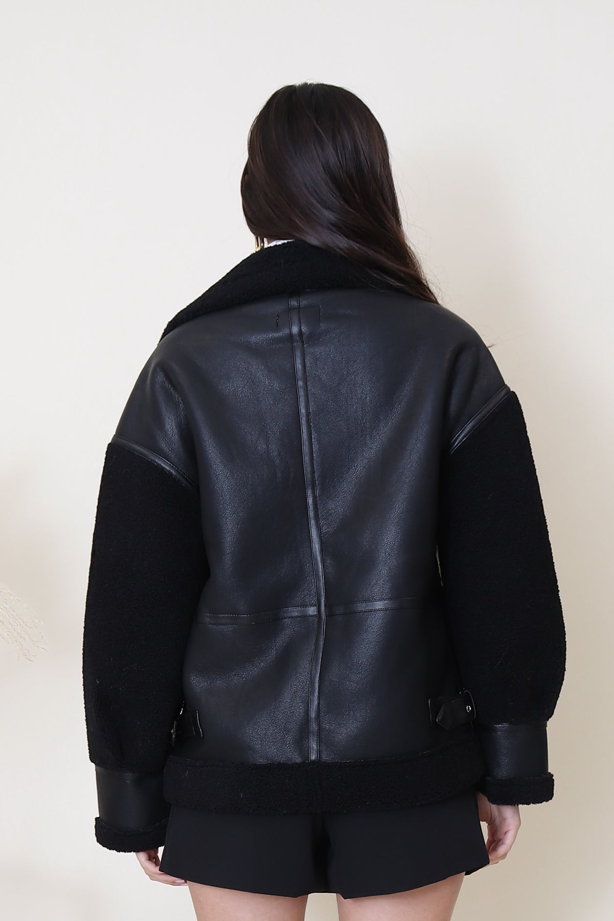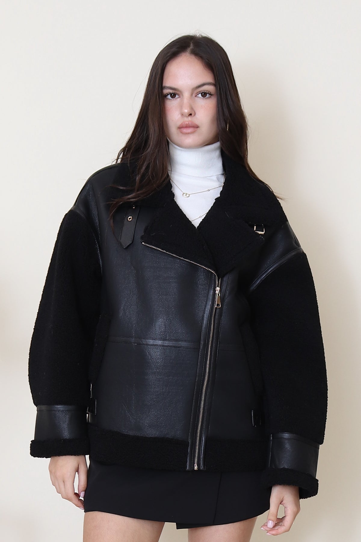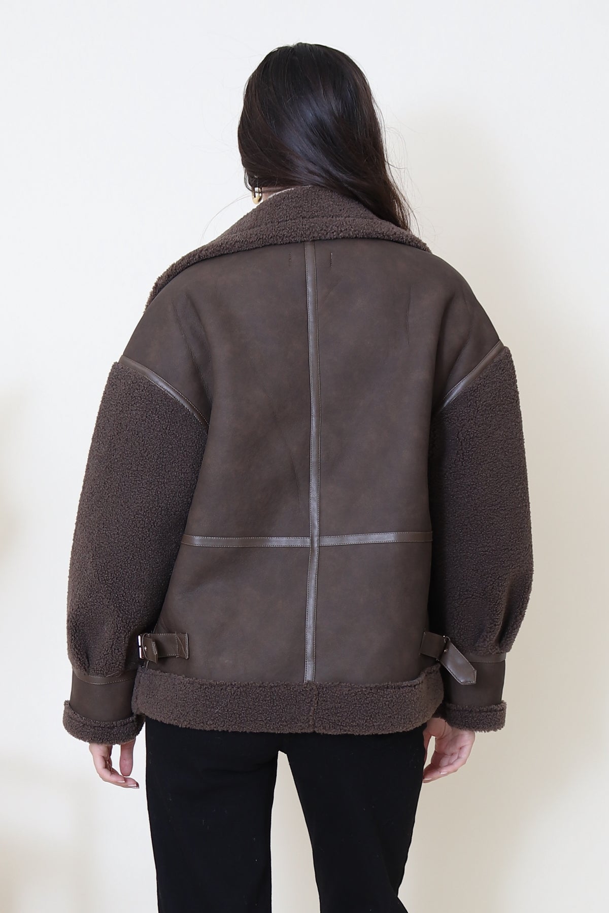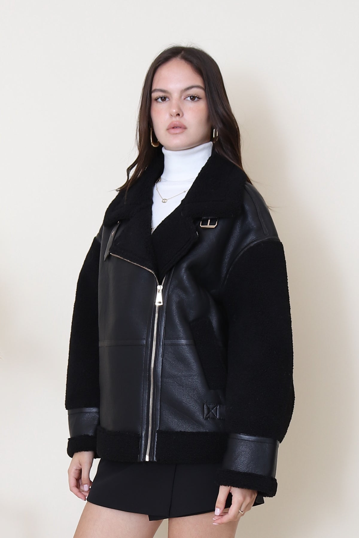Veste aviateur oversize effet moutonnée doublée pour un confort optimal et un style affirmé en saison froide.